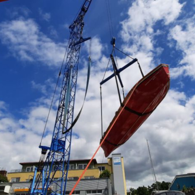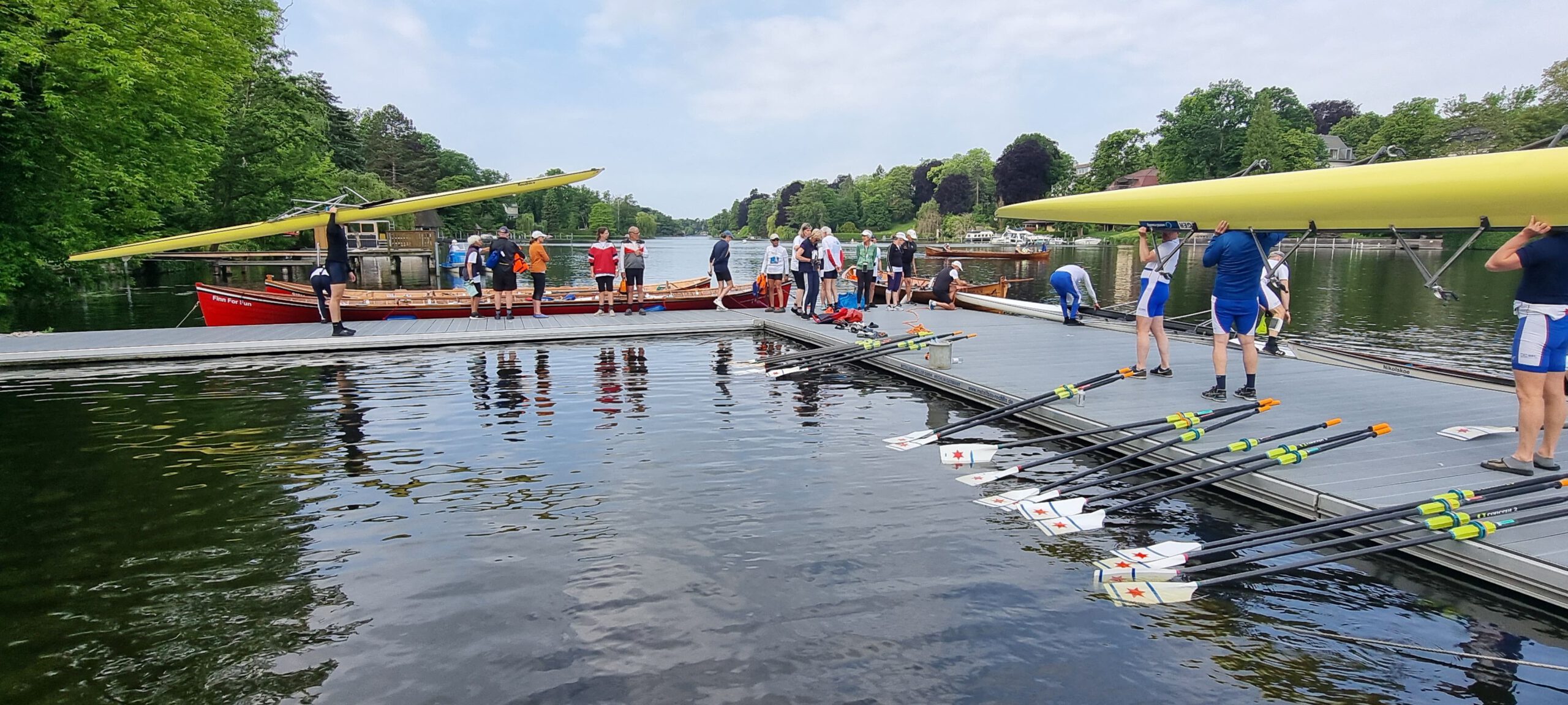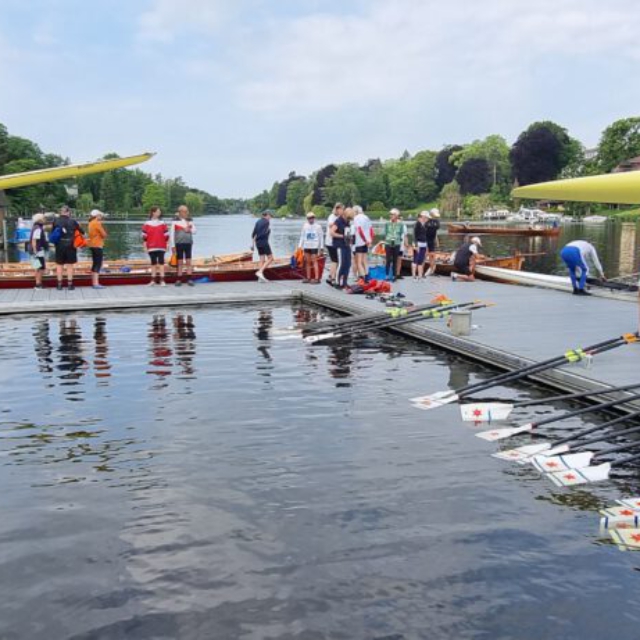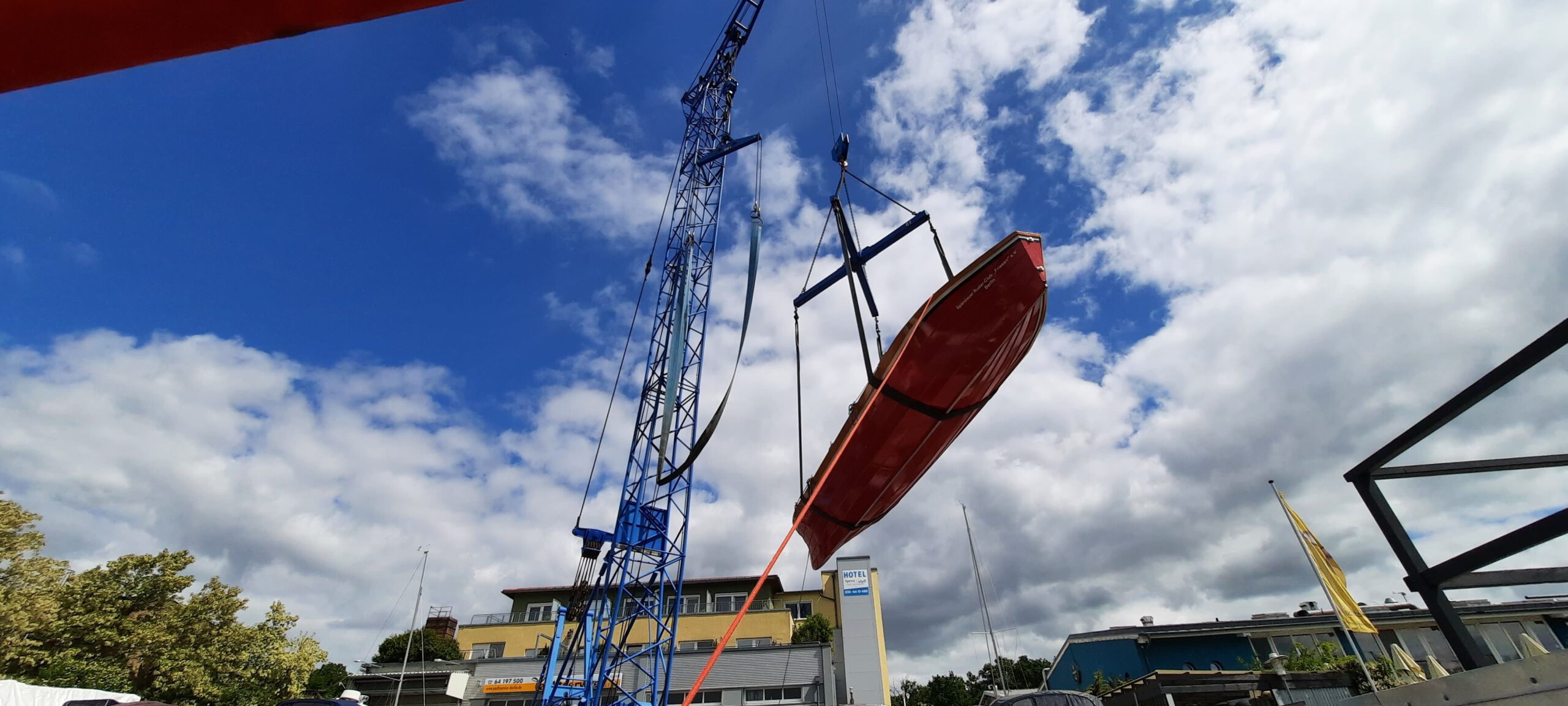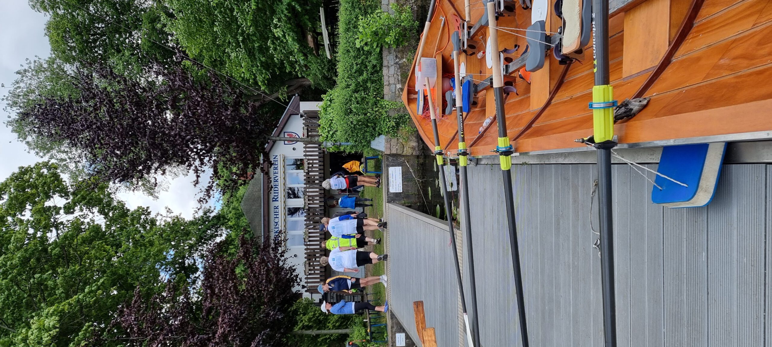 Samstag, 24. Mai: Wir fahren die beiden Friesen-Kirchboote über Land zum Wassersportzentrum Friedrichshagen. Hier werden die Boote gekrant und dann mit einem Minimalismus an Personal zum Friedrichshagener Ruderverein und zum BRC Ägir gerudert und zwischen den Stegen diagonal vertäut.
