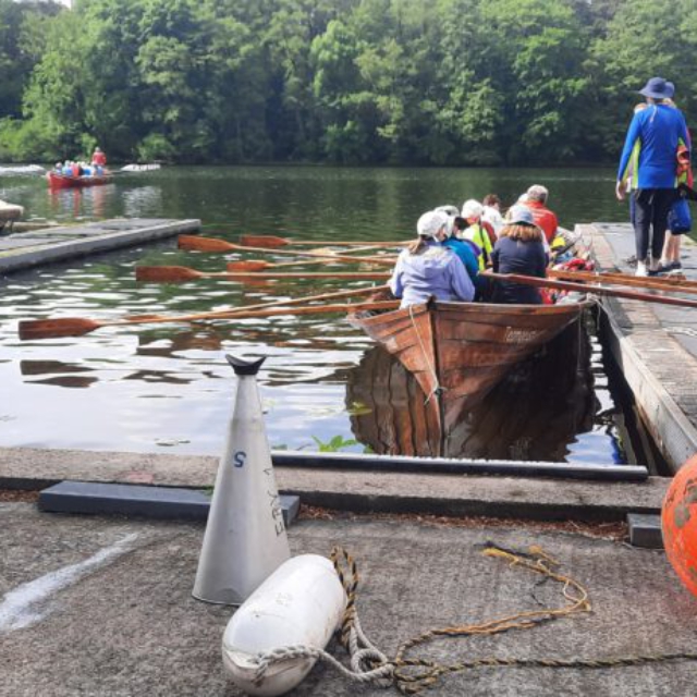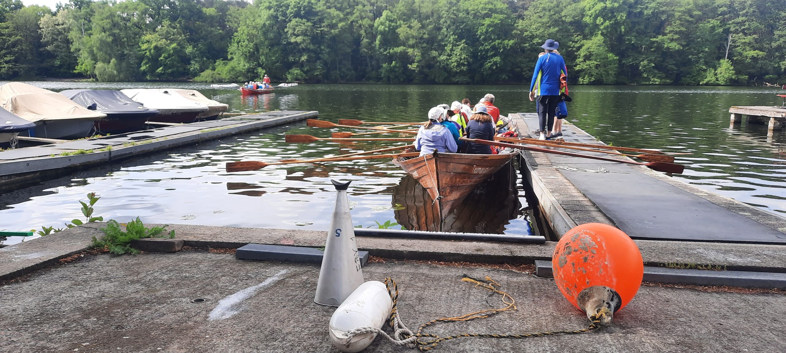 Donnerstag, 29. Mai: Himmelfahrt. Es geht durch die Schleuse Spandau zur Sternfahrt bei der RU Arkana. Vor der Schleuse müssen wir warten und bei Arkona wartet man auf uns. Wir sind angekündigt. Nach dem Schleusen legen wir bei den Friesen und beim Märker-Bootshaus an. Uwe (Aufsicht an diesem Tag) fragt besorgt: „Wollen die jetzt alle hier `nen Bier trinken?“ „Keine Sorge, nur ins Pipi-Kaka-Land und mal meinen Verein zeigen“, antworte ich. Unsere gut gepflegten Klinkerboote sind ein echter Hingucker und begeistern. Doch wir müssen weiter und legen ab. Die Kirchboote sammeln sich in der Scharfen Lanke und stellen die Riemen zur Begrüßung auf. Wir bekommen Applaus und eine Lautsprecher-Begrüßung. Es dauert eine Weile bis alle ausgestiegen sind und die Sternfahrt-Atmosphäre genießen. Das obligatorische „Aloha Heja He“ wird von unseren Gästen genau beobachtet. Irgendwann legen wir wieder ab. Vielen Dank an die RU Arkona für die absolut unkomplizierte Abrechnung! Wir rudern weiter Havel abwärts bis zum RV Collegia 1895. Die Boote „übernachten“ ein paar Meter weiter an den Stegen beim Wassersportheim Gatow.