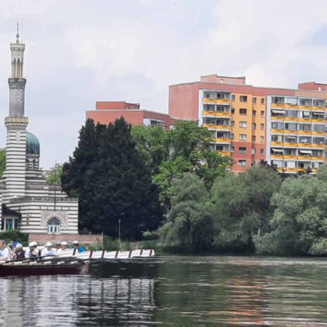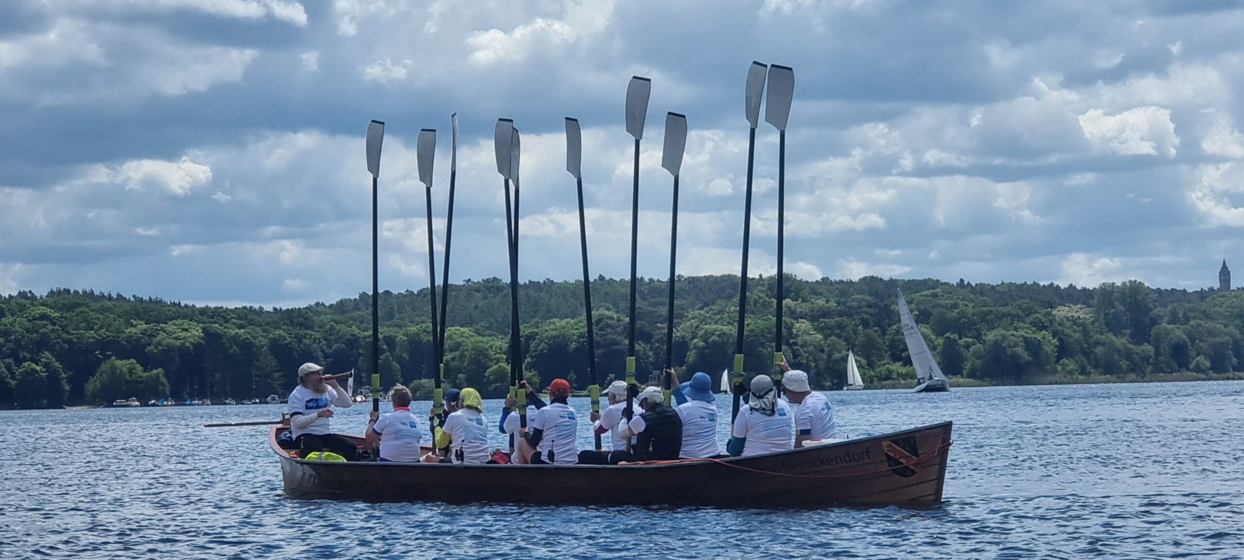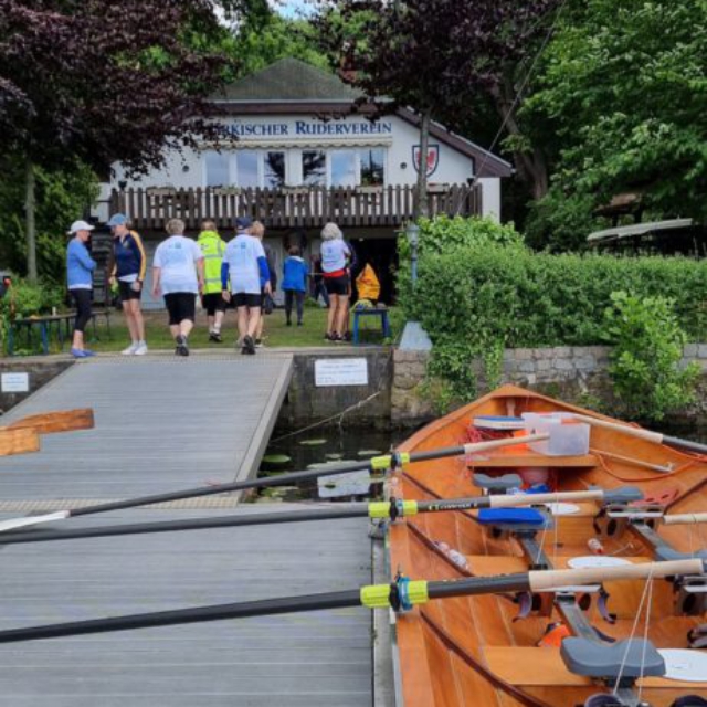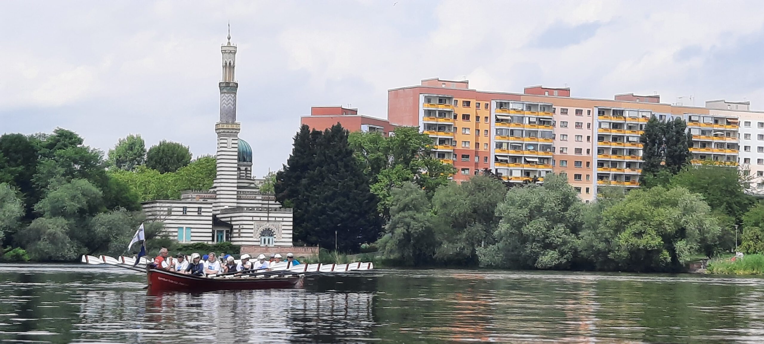 Samstag, 31. Mai: Letzter Rudertag. Beim BRC ist Samstag Hochbetrieb. Ständig legen Boote ab und an. Irgendwie finden die Kirchboote nach und nach eine Lücke. Wir rudern über die südliche Seenkette Richtung Schloss Babelsberg. Die Villen stehen imposant am Ufer. Welche war noch einmal die Villa, in der Winston Churchill während des Potsdamer Abkommens wohnte? Hinter der Glienicker Brücke machen wir eine kurze Pause. Wir genießen das historische Ambiente bevor wir zur Sacrower Heilandskirche weiter rudern. Die Kirche steht seit 1992 als Weltkulturerbe unter dem Schutz der UNESCO. Weiter geht es zur Meierei Potsdam, um einen Blick auf die Muschelgrotte im Neuen Garten und Schloss Cecilienhof zu werfen. Vorbei an Kongsnæs, der Kaiserliche Matrosenstation, rudern wir zum Langen See, weiter durch die Alte Fahrt und in die Neustädter Havelbucht. Potsdam ist immer wieder beeindruckend! Unsere Fahrt endet bei der Potsdamer Rudergesellschaft. Sektempfang im Seekrug. Nur noch selten kommt man in diesen schönen Saal hinein. Ulrike Hartmann, Präsidentin des Landesruderverbandes Brandenburg, begrüßt die Teilnehmer der Wanderfahrt. Ruderer von TiB-Oberspree und vom BRK Brandenburgia mischen sich unter uns. rudern das TiB-Kirchboot nach Hause. Abends findet beim Berliner Ruderclub das Farewell-Dinner statt. Was für ein toller Abend! Die einzelnen Nationen bedanken sich für die schöne Woche. Es tut gut und ich merke, wie die Anspannung der letzten Tage verschwindet.