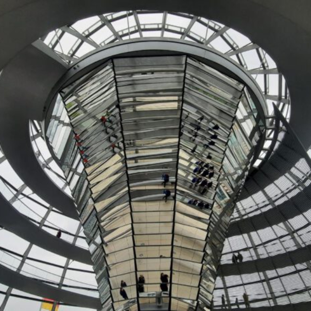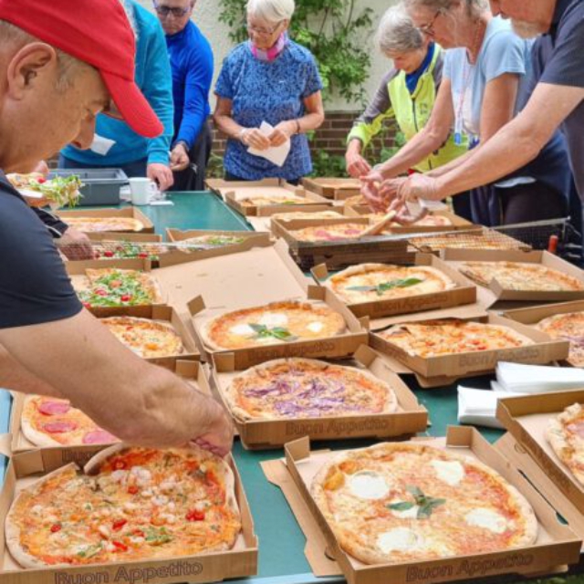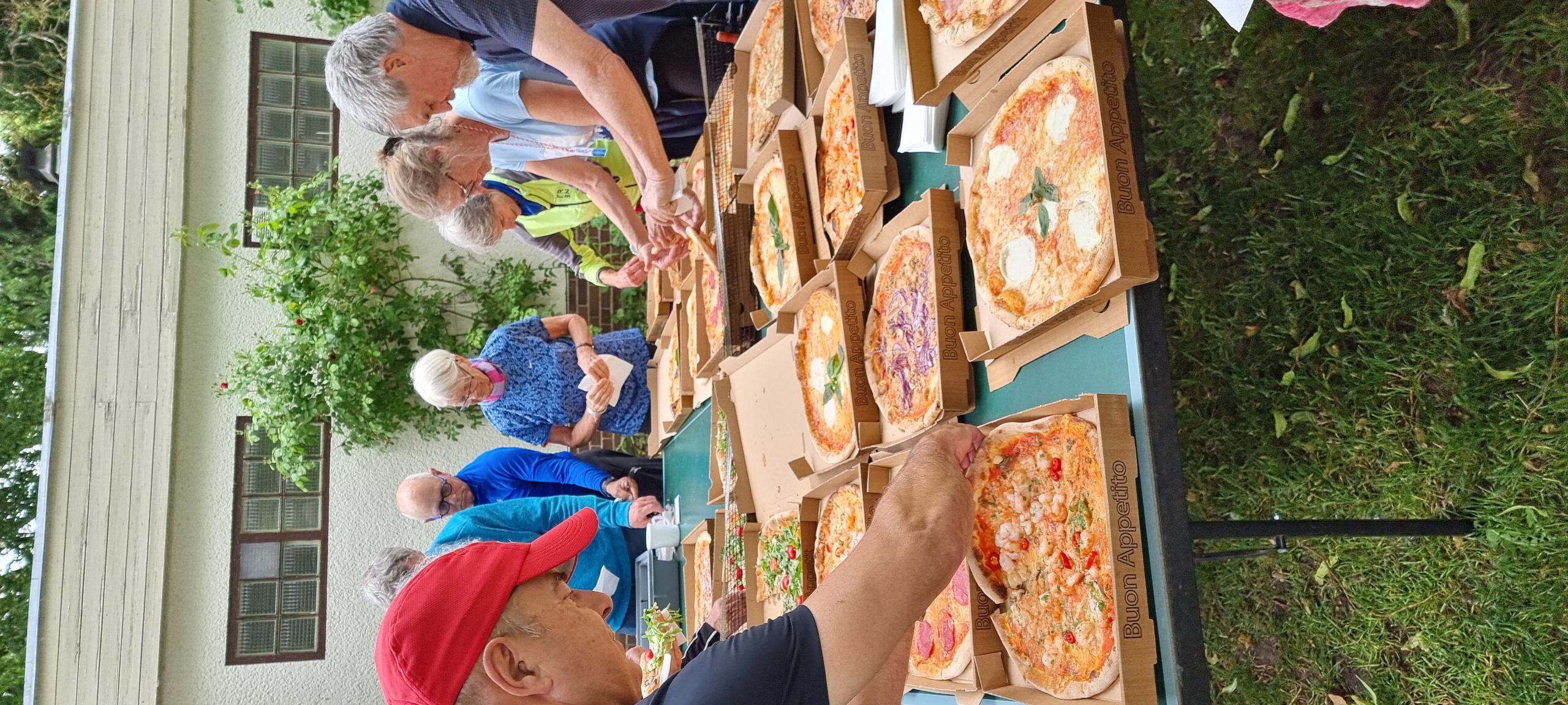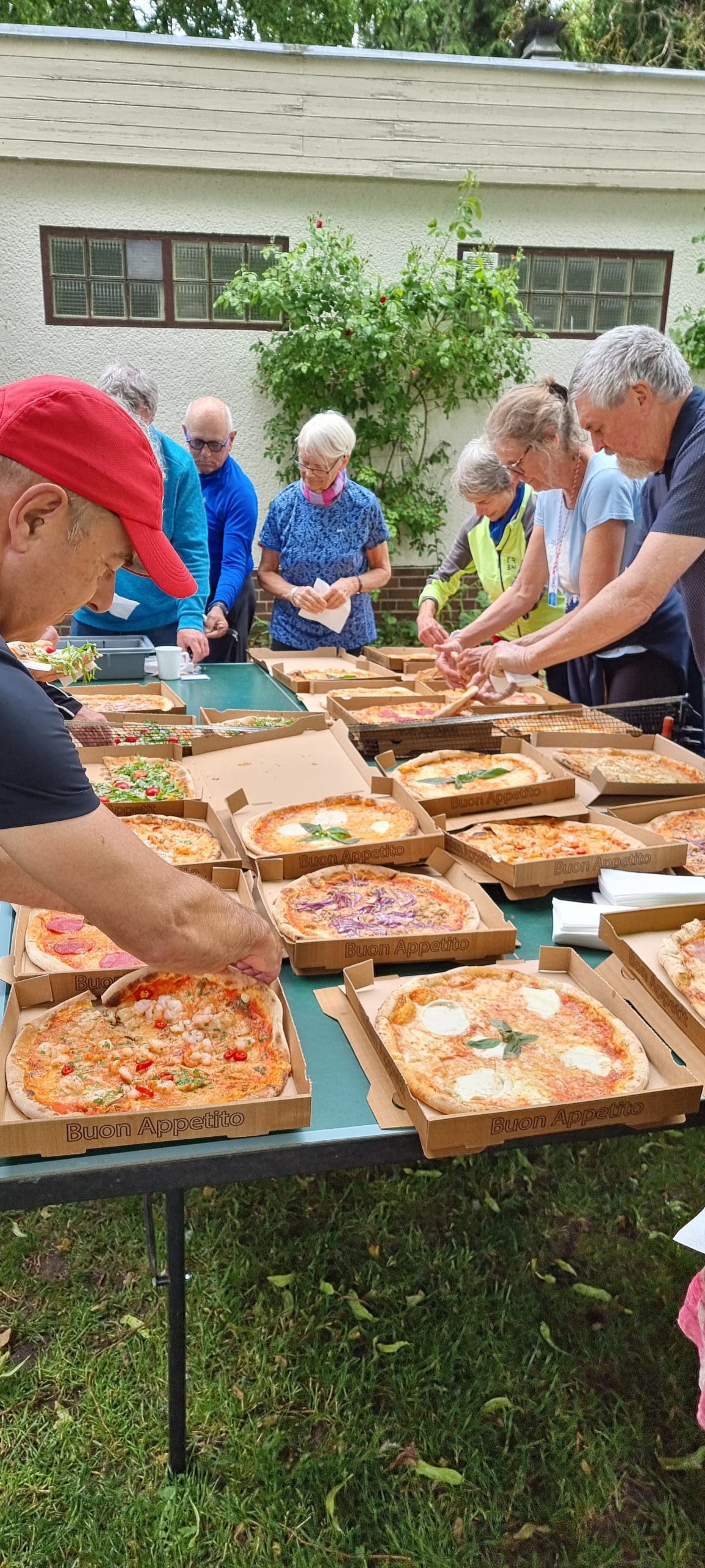Freitag, 30. Mai: Hotelwechsel. Das bedeutete auch für das Orga-Team im LRV Klamotten packen. Vormittags ist Kultur angesagt. Mit dem Bus werden wir zum Bundestag gebracht, während Thomas das Gepäck zum Mercure Hotel in Potsdam fährt. Die Kuppel ist beinduckend, der Blick über die Stadt gigantisch. (Warum war ich eigentlich noch nie hier oben?) Ich hoffe, dass alle pünktlich am Bus sind. Sie sind es! Der Bus fährt uns direkt zum RV Collegia. Noch im Bus bestelle ich Pizza in einem Ristorante in Gatow. (Hier war ich vor ein paar Wochen mit meinem Mann Probeessen. Nichts wird dem Zufall überlassen!) Die Collegia-Jugend hilft beim Pizza-Transport. Was für ein irrer Anblick: eine Tischtennisplatte voller Pizzen! Nach dem Schmaus rudern wir Richtung Breitehorn, weiter geht es innen an Imchen vorbei und um die Pfaueninsel herum. In Höhe des Schlosses gibt es den Versuch eines Kirchboote-Gruppenfotos. Der Wind ist dagegen. Wir rudern Richtung Wannsee. Die Wellen sind für die Kirchboote kein Problem. Am Berliner Ruderclub legen wir an. Zwei Boote bleiben hier am Steg als Päckchen liegen, zwei werden unterbesetzt zum BRC Welle-Poseidon gerudert und „übernachten“ dort. Unsere Gäste genießen den Blick von der BRC-Terrasse auf den Kleinen Wannsee bei kühlen Getränken bis der Bus sie nach Potsdam bringt. In Potsdam gehen abends alle eigene Wege in verschiedene Restaurants.