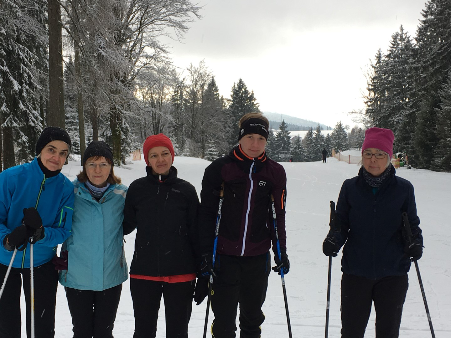 Beate, Odile, Juanita und Petra mit ihrem SkilanglaufLehrer
